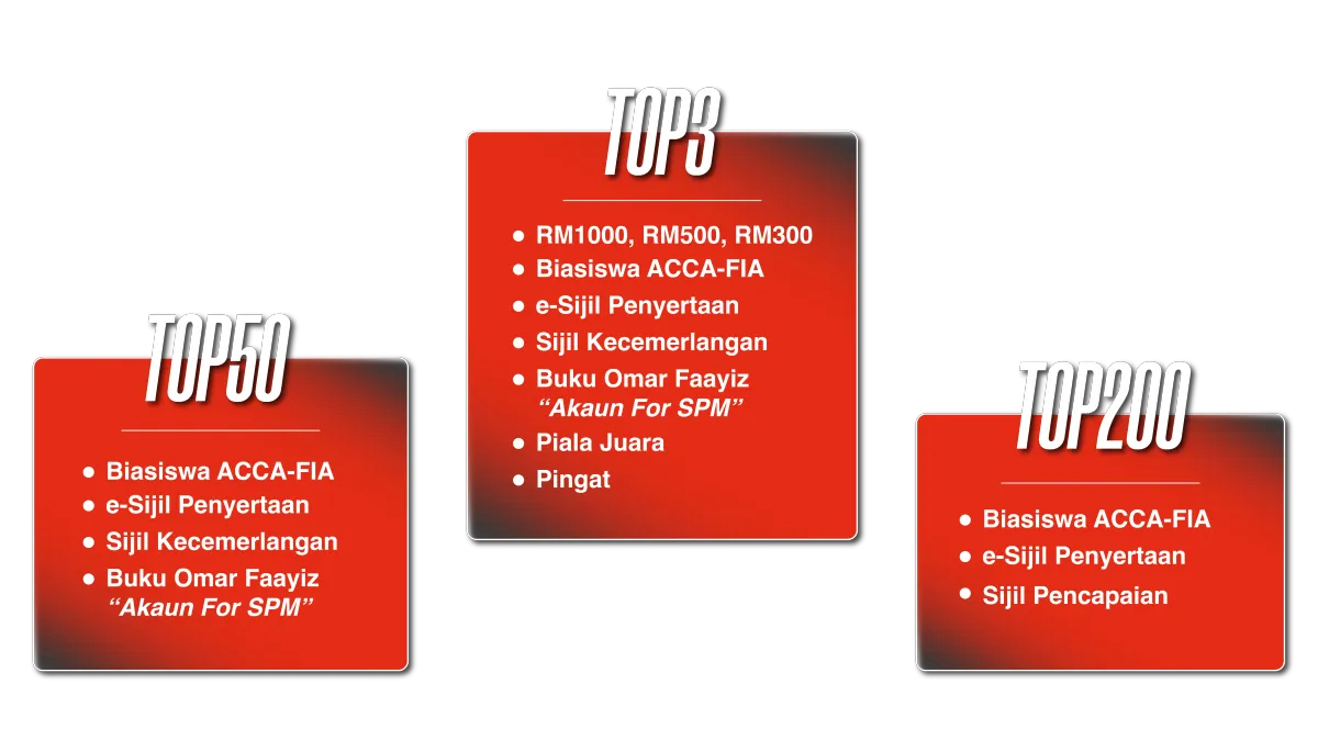 Dengan bimbingan institut, rakan kongsi dan rakan strategik yang ternama di Malaysia, sudah tiba masanya untuk anda menyahut cabaran dan bersaing dalam cabaran perakaunan tahunan berprestij negara ini yang direka untuk menyokong anda mencapai SPM anda dan juga menjamin masa depan anda dalam dunia perakaunan & kewangan.
